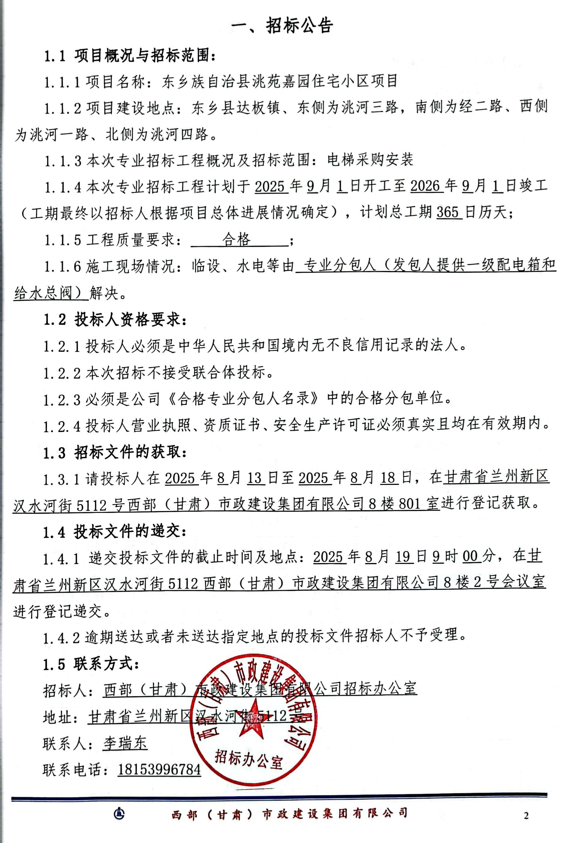 东乡族自治县洮苑嘉园住宅小区项目-电梯采购安装-招标公告