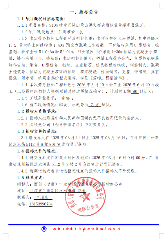 S104榆中兴隆山段山洪灾害灾后恢复重建项目施工-招标公告